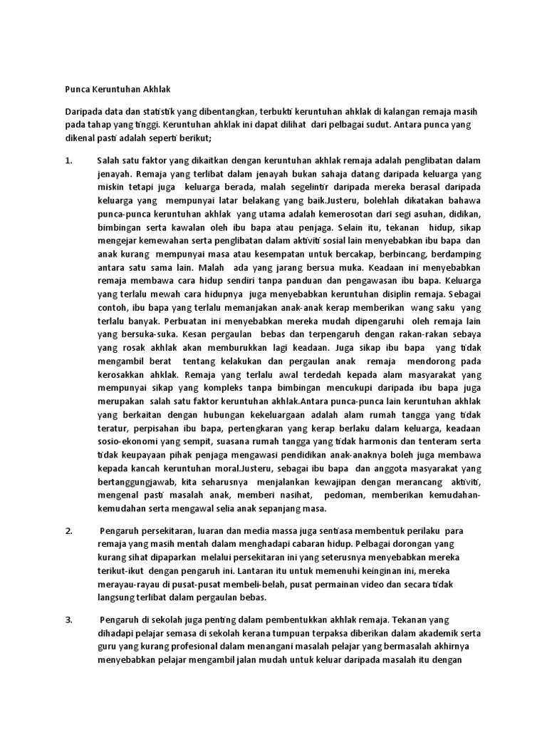Punca Keruntuhan Akhlak Remaja. Full text 1212Remaja berakhlak Negara Berjaya kelak Forum Remaja Perintis. 15 KAEDAH-KAEDAH MENGATASI MASALAH KERUNTUHAN AKHLAK REMAJA ISLAM Perbincangan mengenai keruntuhan ahklak remaja adalah berkisar isu pelajar remaja.