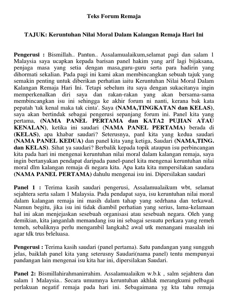 Merekalah yang akan menggantikan generasi terdahulu untuk menerajui dan. 100 karangan contoh pmr dan spm by. Download View Teks Forum Remaja as PDF for free.